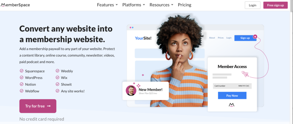 MemberSpace stands out as a versatile third-party tool dedicated to effortlessly integrating membership content into your website, regardless of the platform. It seamlessly supports major website builders such as WordPress, Duda, Webnode, and SquareSpace, offering robust features to enhance membership management.