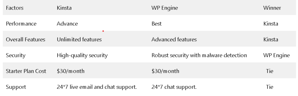 Below is a summary of WP Engine and Kinsta’s head-to-head comparison to see which one is the better pick. These two web hosting companies will be compared and scored based on: Cost: Starter Plan, Performance, Overall Features, Support, & Security.