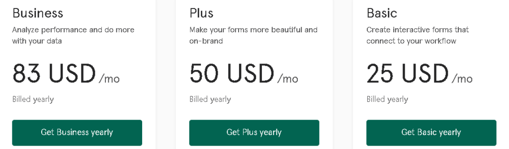 On the other hand, Typeform offers three different pricing & plans, and all these plans vary according to the difference in features so that you can choose the plan that helps you. The three plans are: Basic at $25/month, Plus- $50/month, and Business at $83 per month.