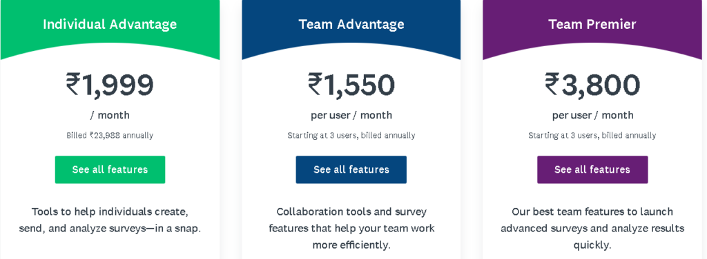 The pricing for SurveyMonkey starts at $28.00 per user per month. SurveyMonkey has four different plans: Individual Advantage, Team Advantage, Premier Advantage, Enterprise Plan. SurveyMonkey’s Individual Advantage plan costs you $27.37/user/month, where its Team Advantage plan starts at $21.23/user/month. The cost of the Premier Advantage Plan is $52.04/user/month. If you are looking for an enterprise-grade solution to gain insights from customers, employees, and the market—securely and at scale, then check with their customer service team to get details about their Enterprise plan.