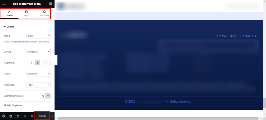 Once you’ve customized the footer to your liking, click “Update” to save your changes. Elementor will apply the edited footer across your site.